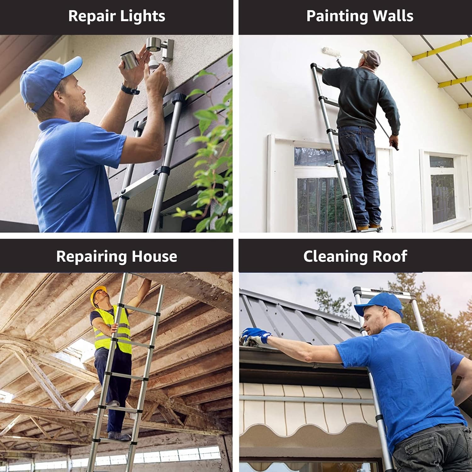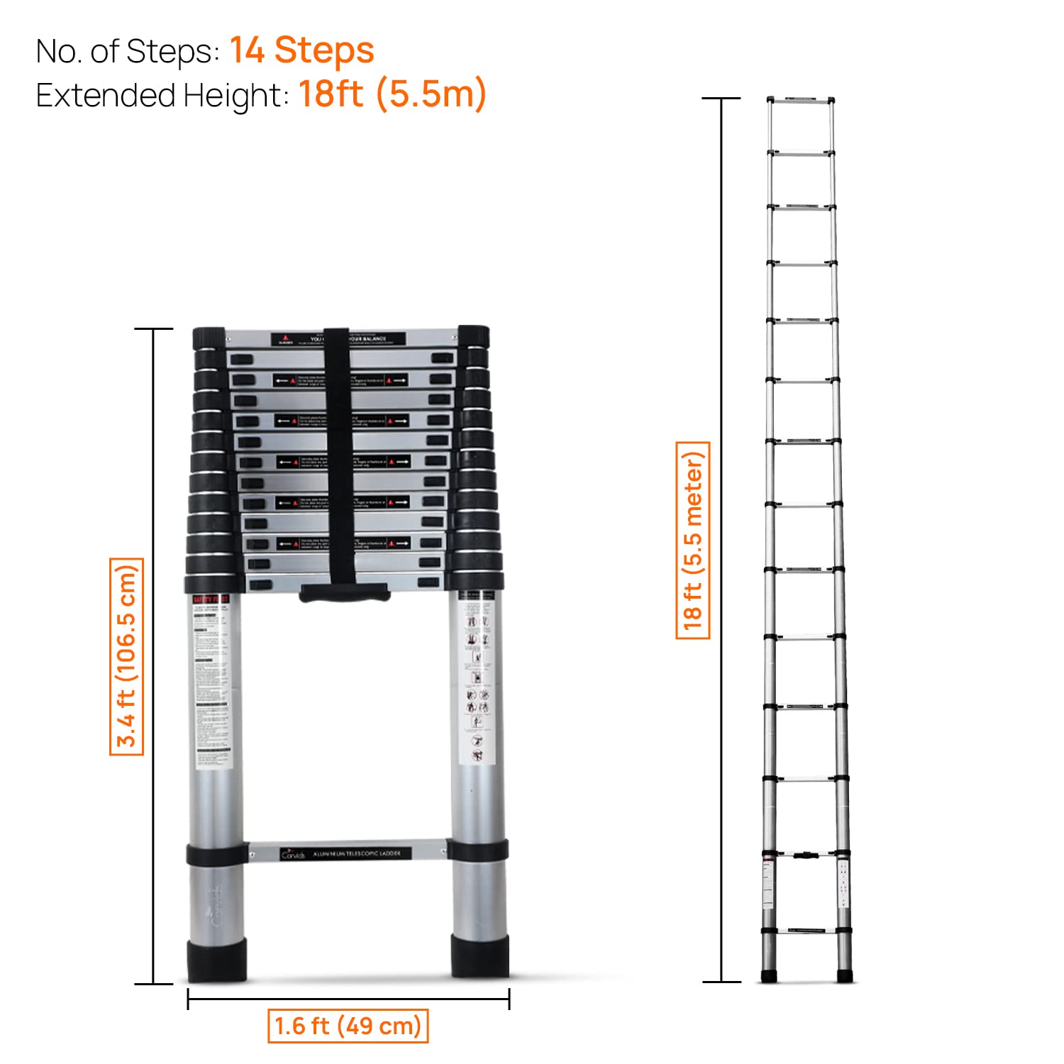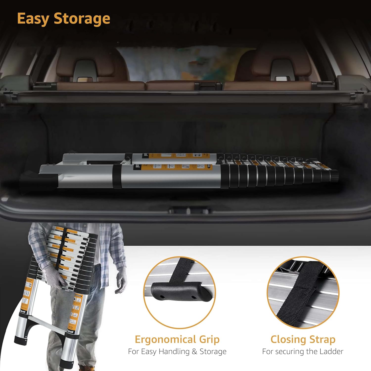 - User-Friendly Operation: The ladder extends and retracts smoothly with an innovative retraction system, ensuring effortless setup and takedown. Our telescopic ladder collapses down to a fraction of its full height, making it incredibly easy to store in small spaces like closets, car trunks, or garages.