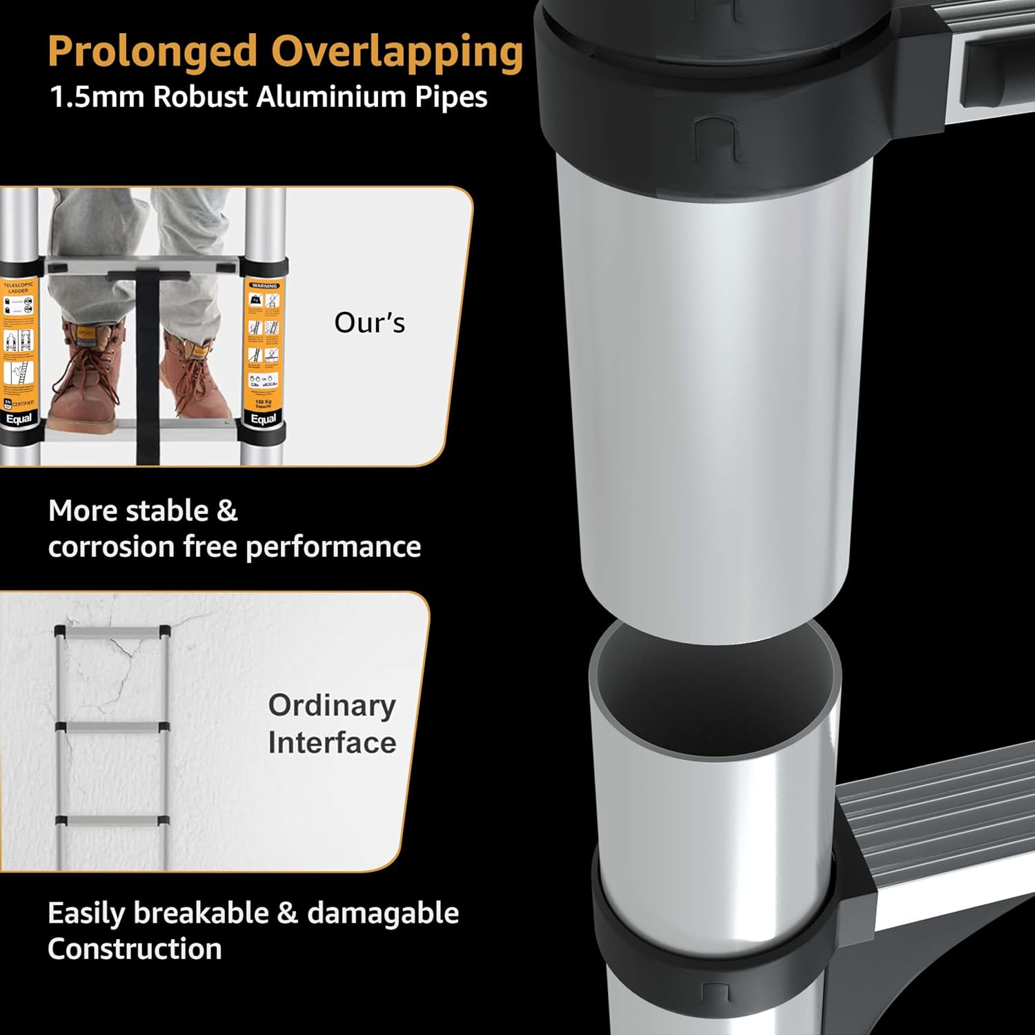 - Durable Construction: Made from high-quality 6063T aluminum alloy, this ladder is both lightweight for easy transport and exceptionally durable, supporting a 150 KG Load Capacity for various uses. The ladder’s premium aluminum construction is resistant to rust and corrosion, making it suitable for both indoor and outdoor use.